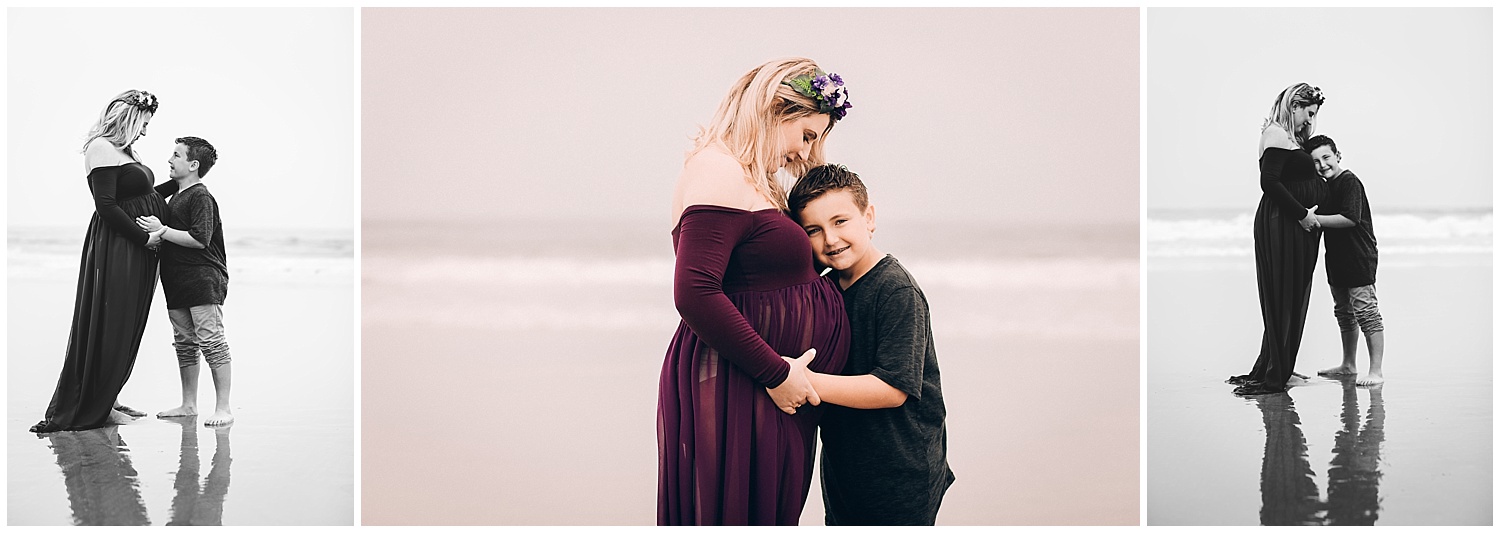 We went to Del Mar Beach on Camp Pendleton. It's honestly one of my favorite beaches. The flat sand creates a beautiful reflection when the water brushes up on it. The day of our session was very overcast and cloudy. Normally, for golden hour session, I LOVE to have that golden light. However, that wasn't an option for this session because sometimes the weather just doesn't want to cooperate. I couldn't be more in love with the beautiful tones that the overcast created. I knew with her dress that the fog over the ocean was going to look incredible. I wasn't wrong. Mommas... never be afraid of an overcast day.